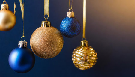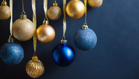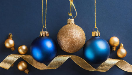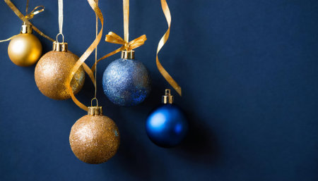 A stylish and minimalistic Christmas and New Year background showcasing golden and blue glass balls gracefully hanging on ribbons. This festive image blends elegance with simplicity, ideal for