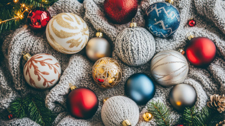 A beautiful display of colorful Christmas ornaments resting on a cozy knit blanket, perfect for evoking holiday spirit and warmth during the festive season.