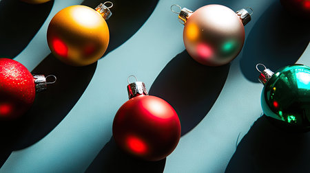 Colorful Christmas baubles arranged on a clean background, casting bold and dramatic hard shadows, creating a modern festive composition with strong lighting contrast.