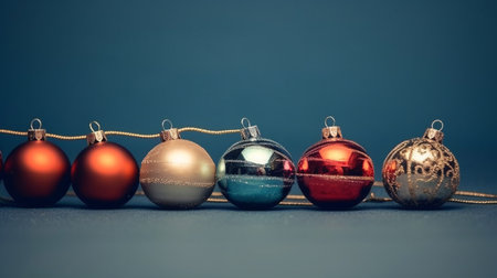 Charming Row of Christmas Baubles Against Black Background: Varied Colors and Finishes Illuminated by Soft Out-of-Focus Lights