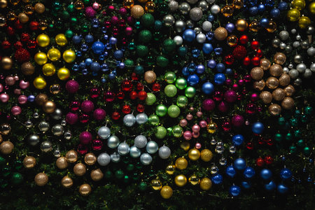 Closeup view of many beautiful christmas or new year fir tree decoration colorful toys.