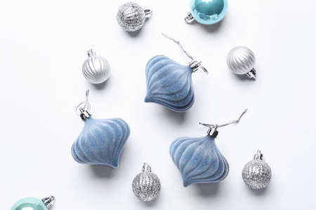 New Years composition. Christmas colorful shiny decorations Christmas tree on a light background.