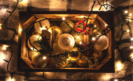 Christmas toys in a wooden box. Bright background for Christmas projects.