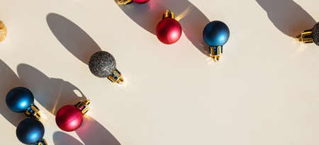 Banner top view of holiday ornament made of Christmas decorations on colorful background. New Year time concept with copy space.