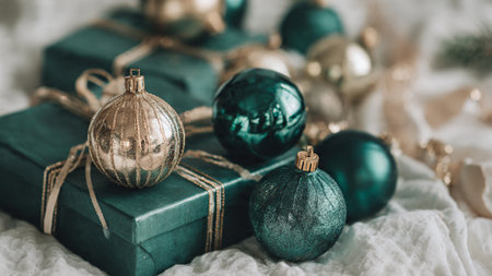 Elegant holiday layout featuring deep-green packages and softly glowing golden accents.