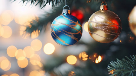 A festive and vibrant close-up view of a Christmas tree adorned with a variety of shiny ornaments and twinkling lights, creating a warm and joyful holiday atmosphere.