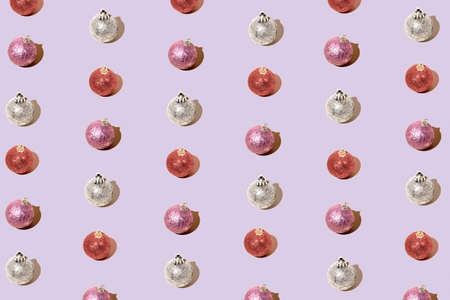 Colorful Christmas balls on purple background. Creative baubles pattern. Minimal New Year flat lay concept.