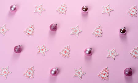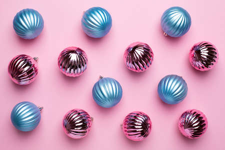 Shiny Christmas blue and pink balls for decoration on pink background , new year pattern top view