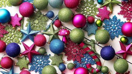 Bright Christmas decorations on a bright, juicy background in full screen.