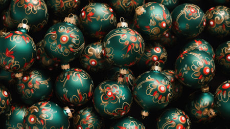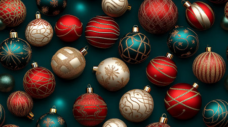 Christmas baubles in rich red and teal hues, adorned with intricate golden patterns, create a festive and luxurious atmosphere. Perfect for adding sparkle to your holiday season. Generated A.I.