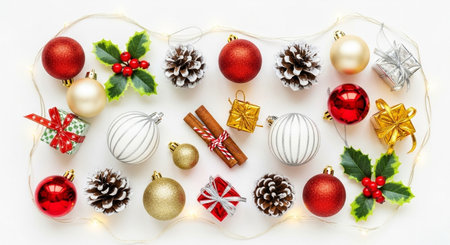 A vibrant arrangement of festive ornaments and greenery perfect for Christmas decoration, capturing the essence of holiday spirit and joy in a flat lay design.