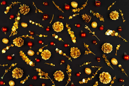 Christmas pattern of holiday decorations on dark background