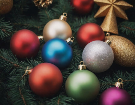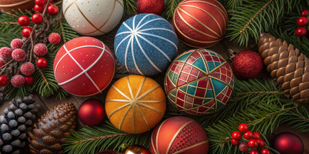 Colorful Christmas ornaments arranged on pine branches with berries and cones. Christmas toys and balls background