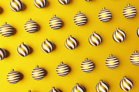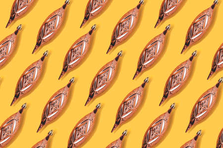 Repetitive pattern made of gold colored Christmas baubles on a yellow background.