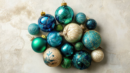 A beautiful collection of Christmas ornaments featuring blue and green hues, perfect for evoking holiday cheer. Ideal for seasonal decoration and festive themes.