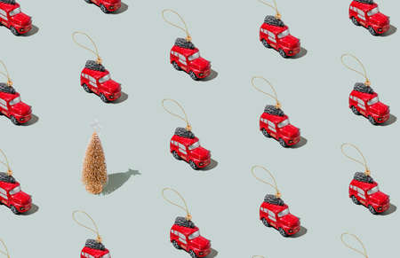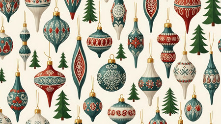 New Year's pattern of gift boxes and Christmas ornaments.