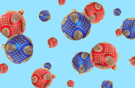 Christmas balls falling against light blue background. Festive ornaments