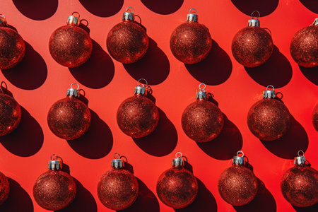 Bright red Christmas ornaments scattered across rich red background, intertwined with warm glowing fairy lights, create festive and cheerful atmosphere perfect for holiday celebrations