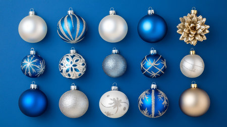 A festive arrangement of blue and silver Christmas ornaments, perfect for holiday-themed designs and backgrounds. Highlighting the beauty of winter decorations.