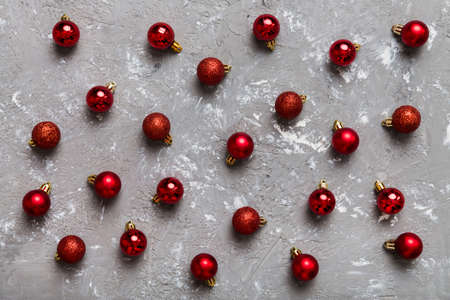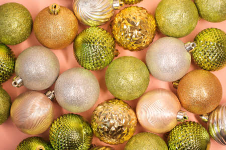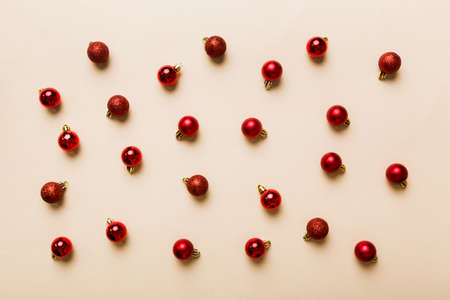 christmas composition. a pattern of christmas balls on colored background. Flat lay, top view New year decor.