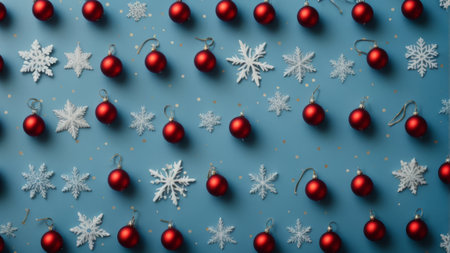 Christmas background with snowflakes and red baubles on blue background