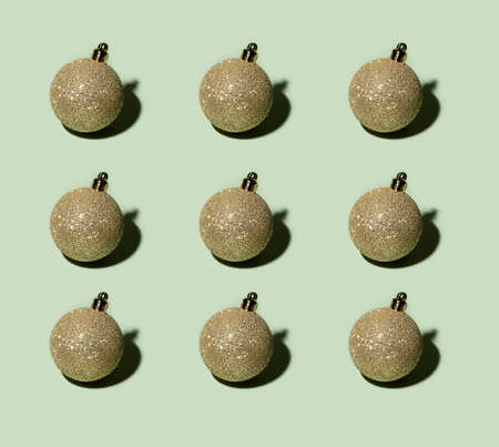 Gold glitter christmas balls baubles pattern on basil green background Harsh shadow. Aesthetic minimal hipster modern background