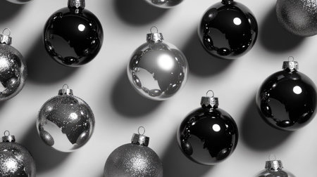 A stylish arrangement of black and silver Christmas ornaments showcasing glossy finishes and intricate textures, ideal for holiday decorations and festive moods.
