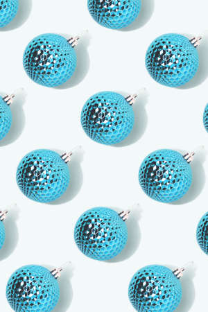Blue Xmas background. Bauble seamless pattern. Winter holidays decor. Festive adornment. Round shiny glitter ball minimalist composition isolated on light.