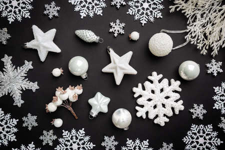 Christmas holidays composition with white christmas decorations and snowflakes on black background with copy space for your text