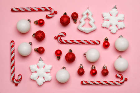 Christmas composition. Red and white decor elements that are used to decorate the Christmas tree. Winter, New Year's concept