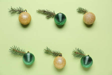 Composition with Christmas balls and fir branches on green background