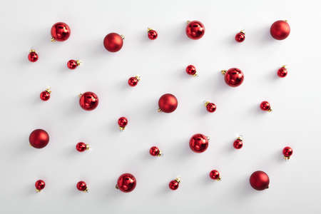 Decorative red balls on a white background. Top view, flat lay. Banner