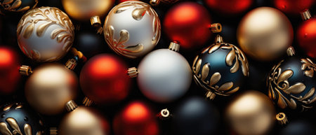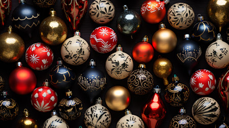 Close up of Christmas ornaments on a black background with copy space.