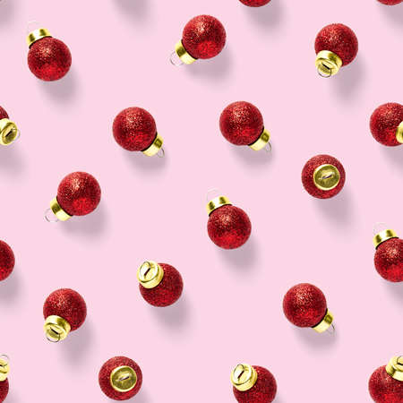 Simple pattern made of red baubles on pastel background. Creative winter composition. Christmas party and festive concept. Minimal style.