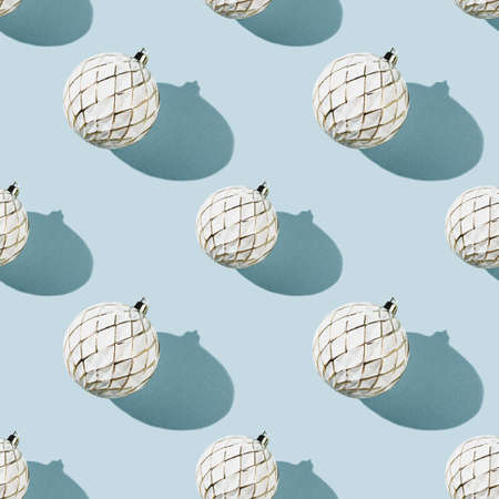 Minimalistic Christmas seamless pattern with white Christmas ball on blue background with shadows.