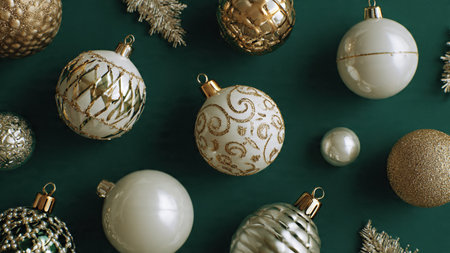 An artistic arrangement of holiday ornaments showcases an array of shimmering gold and silver decorations, perfect for adding a festive touch to any Christmas celebration.