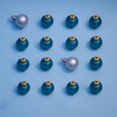 Simple pattern made of silver baubles on pastel blue background. Creative winter composition. Christmas party and festive concept. Minimal style.