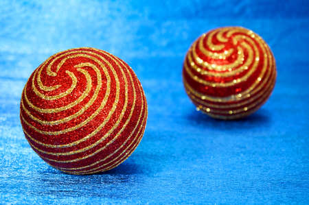 Red Christmas toy with gold stripes on a blue background close-up. New Year, christmas background.