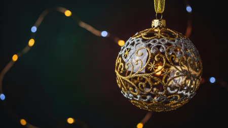 A decorative Christmas ornament is suspended against a dark backdrop with blurred string lights. The spherical object features intricate golden and silver filigree patterns. The composition is lit with soft lighting, creating a warm ambiance. Suitable for holiday-themed marketing or festive design projects.
