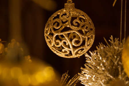 Gold festive glass ball with colored sparkles, Christmas tree and beautiful yellow bokeh of glowing garland. Blurred background.