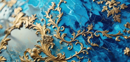 Blue marble background with golden ornaments. Close-up.