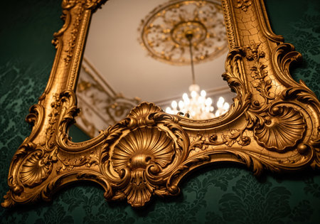 Antique gold mirror frame with ornate rococo detailing mounted on a dark green damask wall. the mirror reflects a grand ceiling and a sparkling crystal chandelier, symbolizing luxury and wealth.