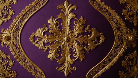 Ornate purple background with elaborate gold floral patterns and textures