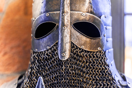 Medieval old knight helmet and chain mail for protection in battle. Very heavy headdress on stand. Middle ages armor concept. Close up, selective focus