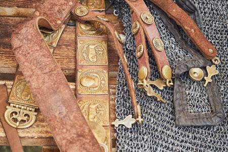 Ancient Roman vintage soldier chain mail and leather belt. Reconstruction of military events during the wars of the Roman Empire