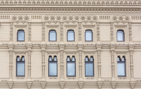 Vienna, Austria - May 12, 2019: Windows in a raw from left to right. Ancient architecture of residential buildings. Elite house, closeup photo of its windows. European architecture of apartments.