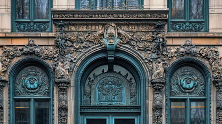 Stunning ornate architectural detail showcasing craftsmanship on a historic building facade, featuring intricate carvings and unique textures in a vibrant green tone.