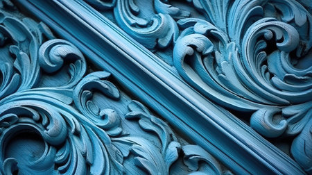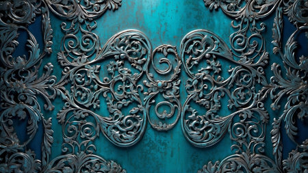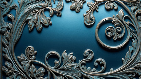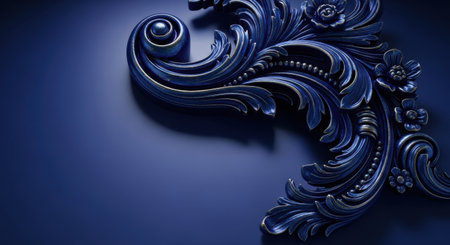 This image showcases a detailed and ornate blue design set against a dark background. The intricate patterns feature swirling lines and floral motifs, creating a sense of elegance and sophistication. The design is highly detailed, with each element carefully crafted to contribute to the overall aesthetic.