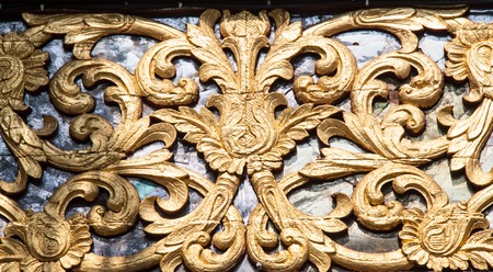 Detailed image of a Rococo Revival golden wood carving, showing leaf-like floral elements and swirling patterns in artistic ornamental style.