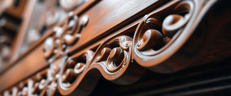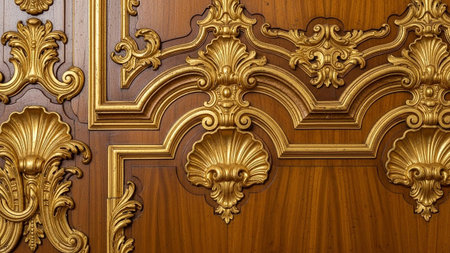 This close-up image showcases the intricate details of a wooden banister with gold accents, reflecting historical craftsmanship in interior design.